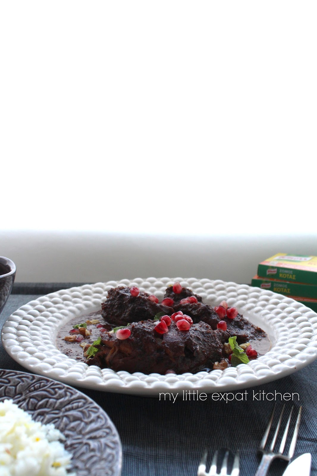 I have a bit of a sweet tooth and this savory dish hits all the right spots. It’s a multilayered dish, mainly earthy and nutty from the walnuts, sweet from the petimezi but not overwhelmingly so, with subtle sharp notes from the vinegar. It’s meaty and deep-flavored, with the chicken falling off the bone but without losing its texture, and with the slightly bitter walnuts being thick and pleasantly grainy creating an almost chocolatey sauce.