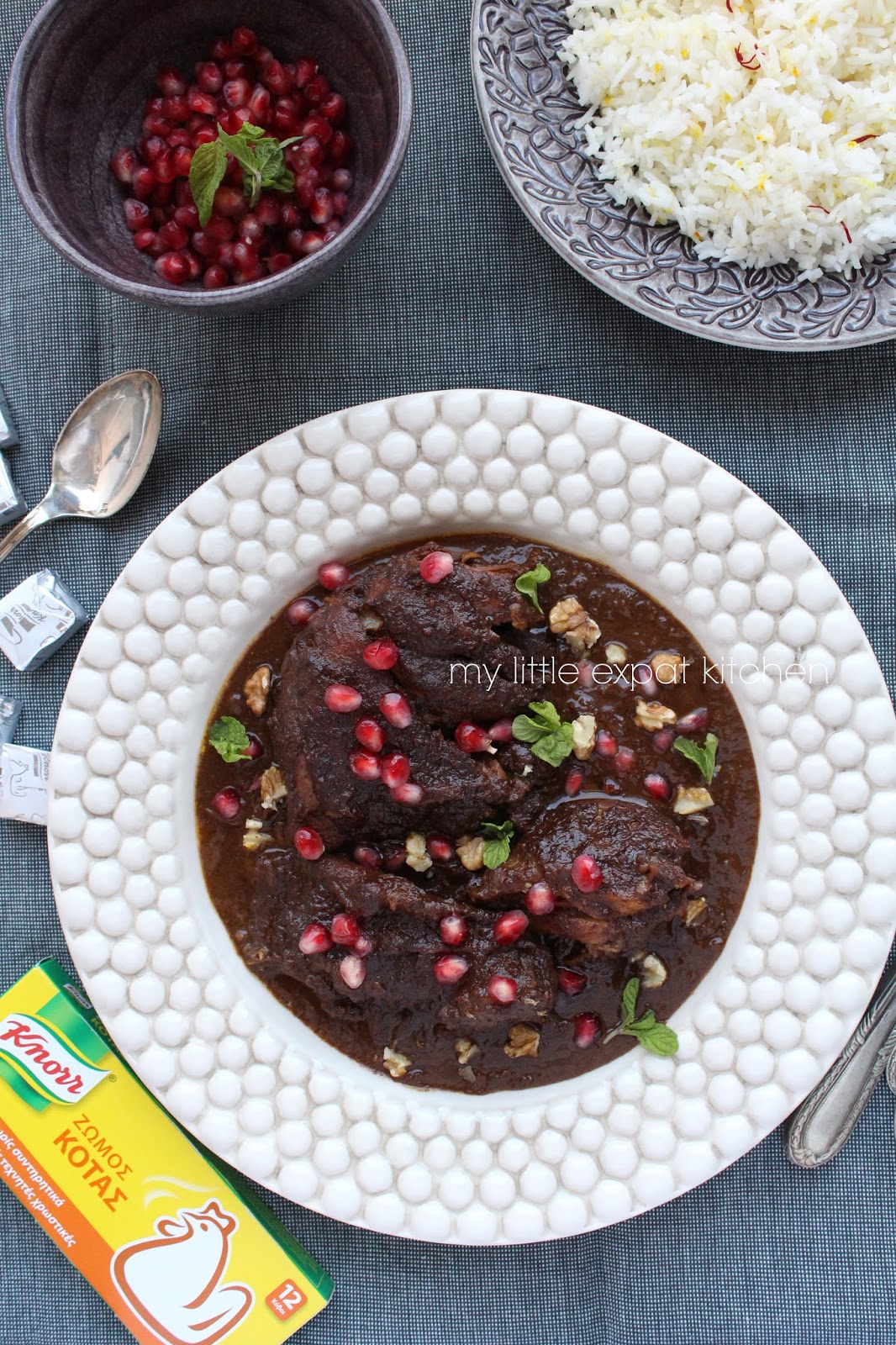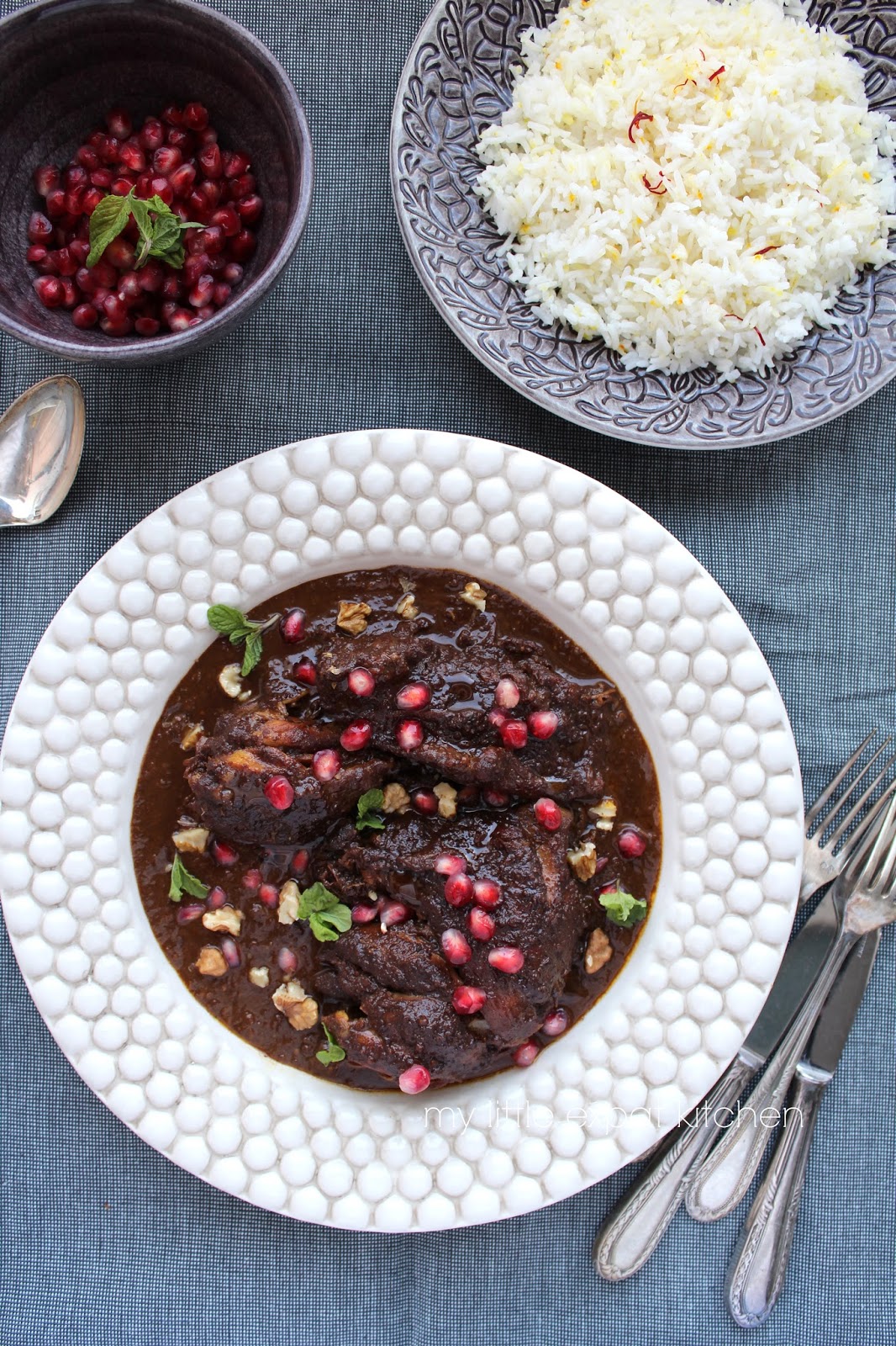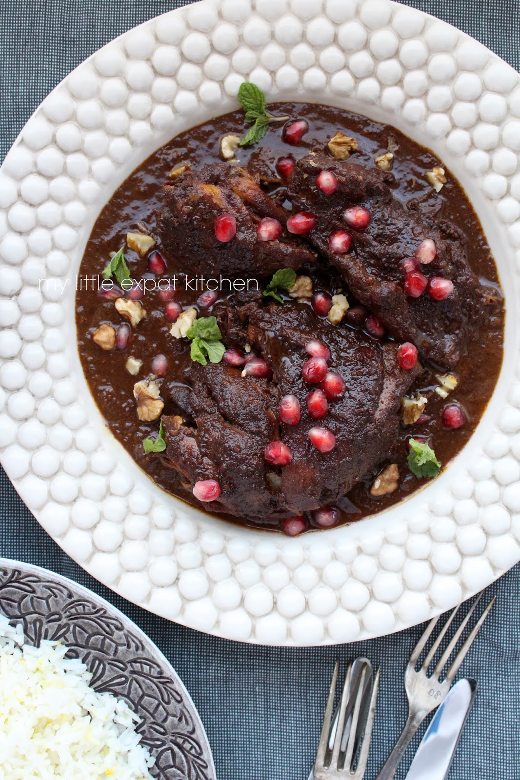 Serve the rice immediately in individual plates. Top with the stew and sprinkle some pomegranate seeds on top, a few chopped walnuts and some chopped mint.