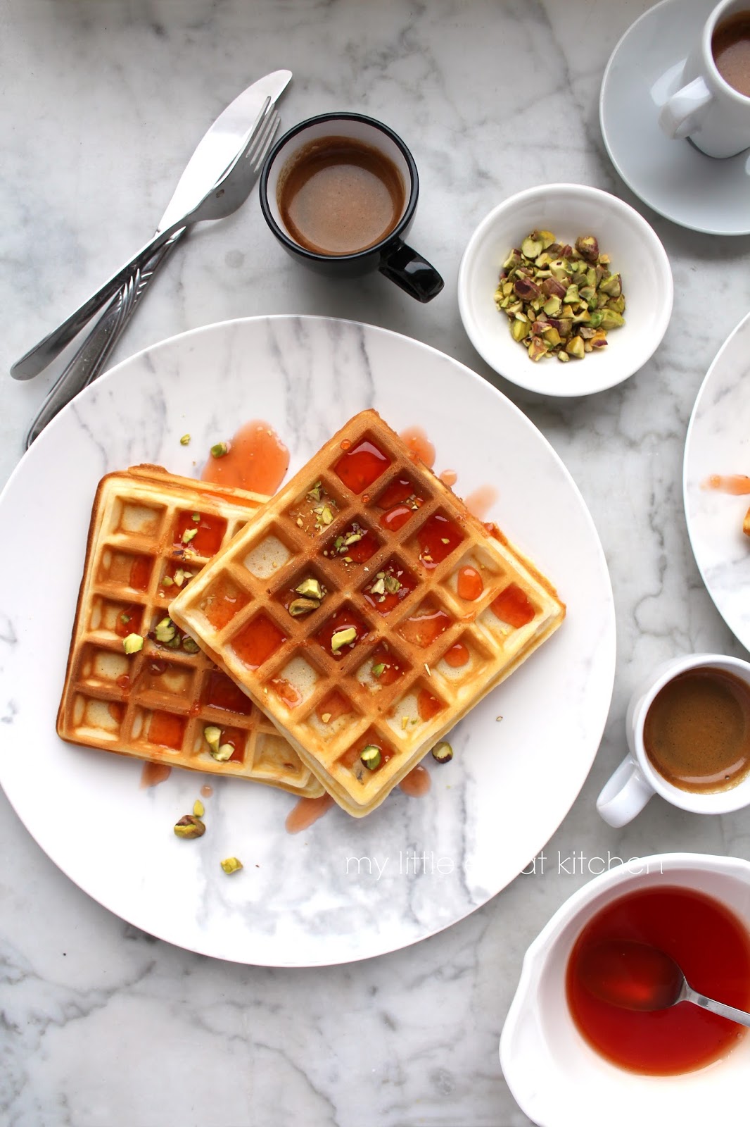 It is straightforward, quick, fuss-free and delicious with the spelt flour providing a subtle nutty flavor to the crispy waffles. I drizzled them with the bittersweet and slightly sharp blood orange and orange-blossom water syrup I made last week, scattered a few chopped pistachios on top for extra texture and they were transformed into a thing of beauty both visually and in terms of flavor.