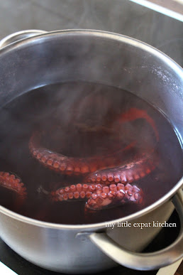 Fill a large pot with water halfway and place over high heat. Once the water boils, add the octopus and simmer over medium-low heat, with the lid on, for 50-60 minutes, depending on how tough the octopus is, until tender. Check it after 30 minutes because not all octopuses are the same. Some cook quicker than others, especially frozen ones. Even though you would never want your octopus to be tough and rubbery you most certainly do not want it to be mushy. It's even worse that way.